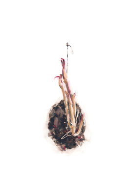 Lié au projet d'expérimentation Point d'arrêt, les illustrations de la série Le germe représentent les rhizomes et les tubercules (gingembre, curcuma, patate et topinambour) utilisés tout au long de l'exploration. D'un filet crocheté autour d'eux, j'ai illustré les phases de leur croissance.