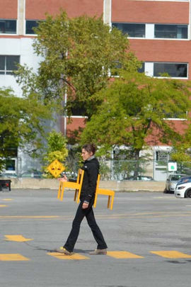 La première semaine, j'ai installé deux petites chaises jaunes là où une ouverture dans la clôture laisse les passants traverser la voie ferrée. À travers le sentier, j'ai peinturé des bandes jaunes perpendiculaires au chemin pour amplifier l'idée du passage déjà présent. Cette intervention passive sur le lieu a permis d'indiquer aux usagers une reconnaissance de l'usage du lieu pour ce qu'il est.